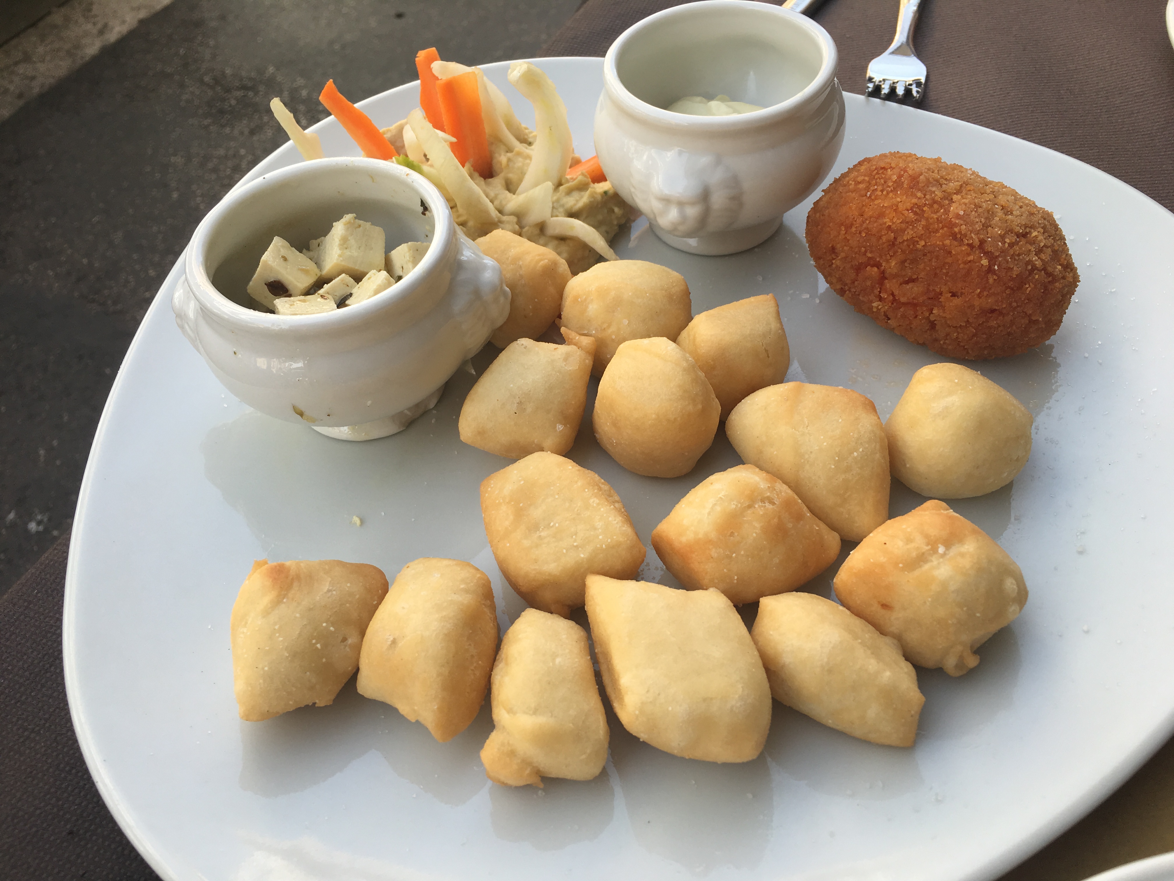 On my first trip, I had pizza with vegan mozzarella and it was so creamy. I was very impressed.  We also enjoyed the vegan antipasto which contained really interesting garlic bread balls, house made vegan mayo, fried rice ball, hummus, and marinated tofu. Me and my non-vegan friend both enjoyed it.  For dessert, they had a special cake on the menu, I would provide details but I spaced when they mentioned chocolate.