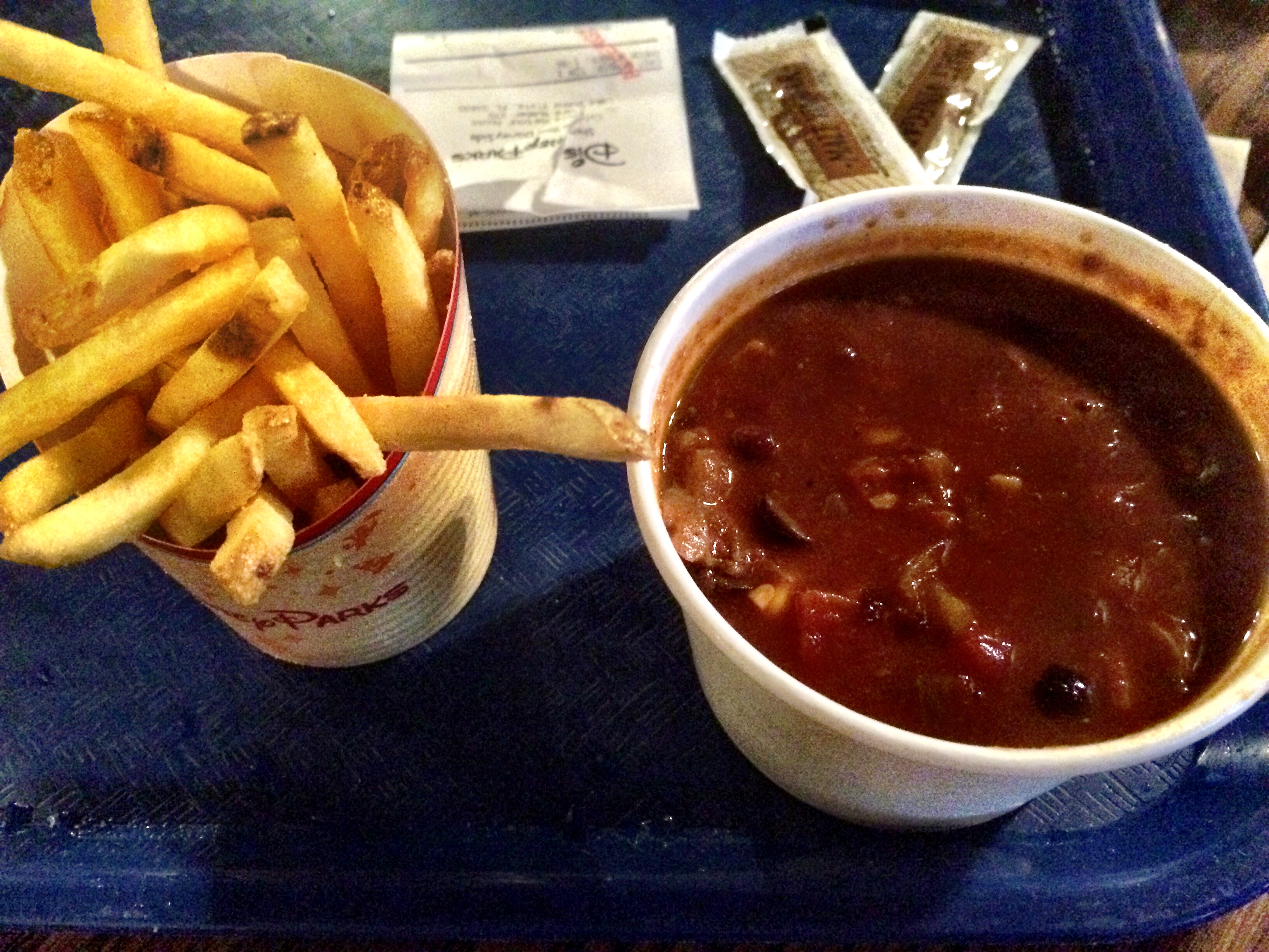 ALREADY VEGAN: Vegetarian Chili ($4.99) & French Fries ($2.99) (if you do not mind the joint fryer.)
